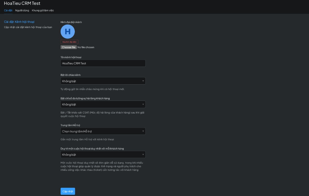 - Tên kênh hội thoại: Đặt tên cho kênh này trên CRM để dễ nhận diện (Ví dụ: HoaTieu CRM Test).