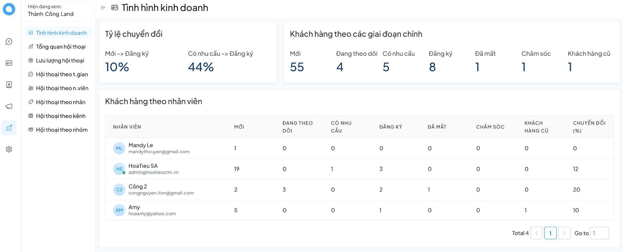 - số lượng khách hàng ở từng giai đoạn của mỗi nhân viên phụ trách, kèm tỷ lệ chuyển đổi