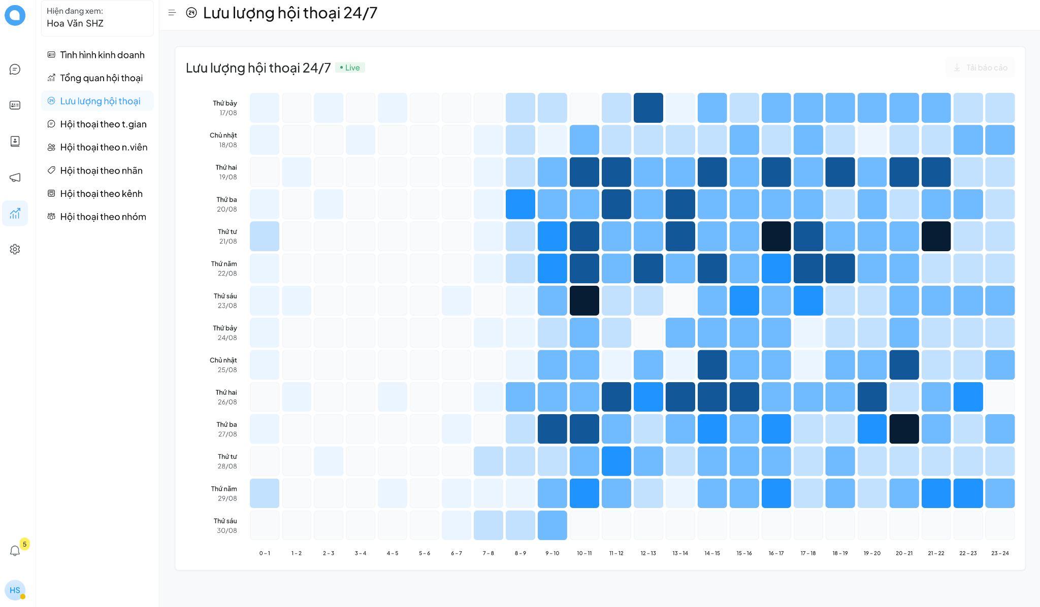 Báo cáo này cung cấp xu hướng hội thoại ít hay nhiều vào mỗi ngày trong tuần, và mỗi khung giờ trong ngày.