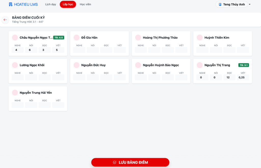 Sau khi hoàn tất nhập liệu cho cả lớp, nhấn nút đỏ “LƯU BẢNG ĐIỂM” ở cuối màn hình để cập nhật kết quả vào hồ sơ học viên.
