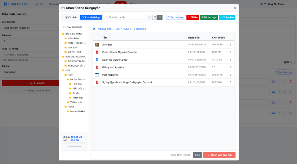 - Chọn file và nhấn Chèn vào câu hỏi. Hệ thống sẽ tự động hiển thị ảnh, trình phát video hoặc link tải phù hợp.