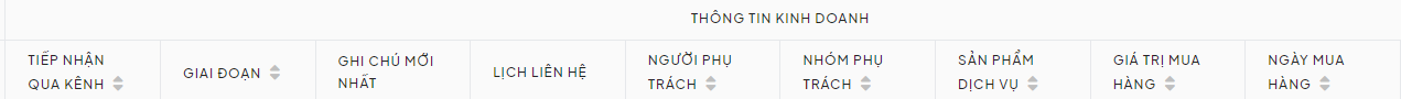 Các cột thông tin chính của một khách hàng gồm: tên, thông tin cá nhân, thông tin kinh doanh, thông tin tùy chỉnh, thông tin theo dõi: