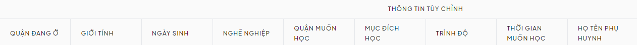 - Thông tin tùy chỉnh: chi nhánh, nguồn thông tin, quận đang ở, …
