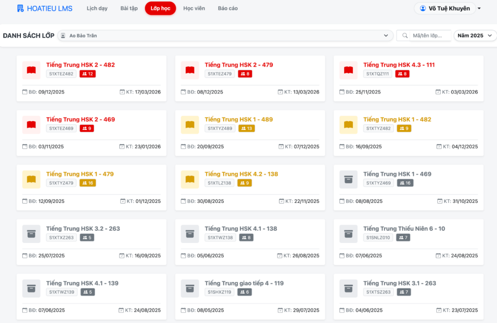 – Màn hình Danh sách lớp (Tổng quan): Giao diện này giúp bạn quản lý danh mục các lớp học hiện có dưới dạng thẻ (Card) trực quan.