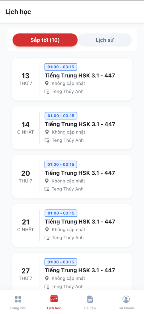 1. Lịch học Sắp tới (Mặc định) Ngay khi vào mục này, bạn sẽ thấy danh sách các buổi học trong tương lai (Tab “Sắp tới” đang được chọn màu đỏ):
